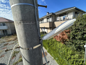 施工前は、古くなった蛍光灯の防犯灯が設置されており、球切れや明るさ不足が確認できる状態でした。 今回の工事では、自治会が管理する防犯灯5基を対象に、LED防犯灯への交換作業を行いました。
